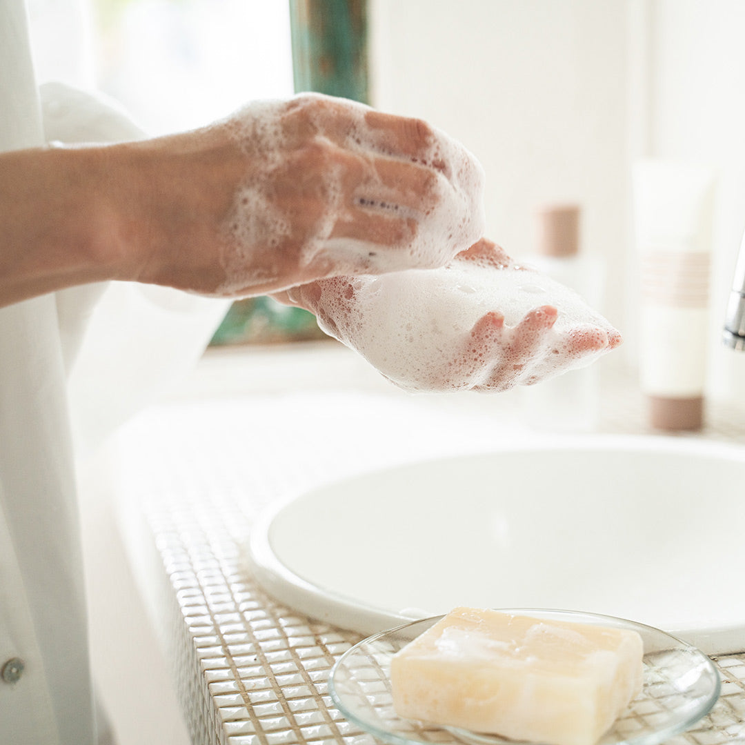 - お湯を少しずつ足しながら手と手を優しくこすり合わせ弾力のあるふっくらした泡を作ります。